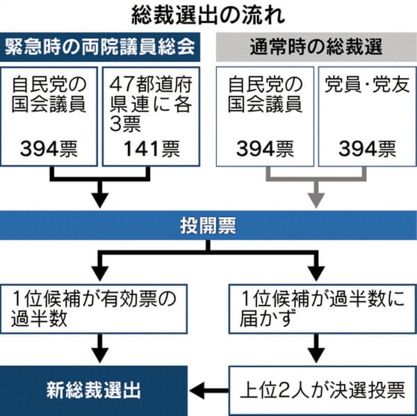 今回のように総裁が任期中に辞めるといった緊急時は、党則の定めにより党員投票がない両院議員総会で選出できる。この場合、議員票は394票のままだが、地方票は47都道府県連に3票ずつ割り当てるため141票となる。